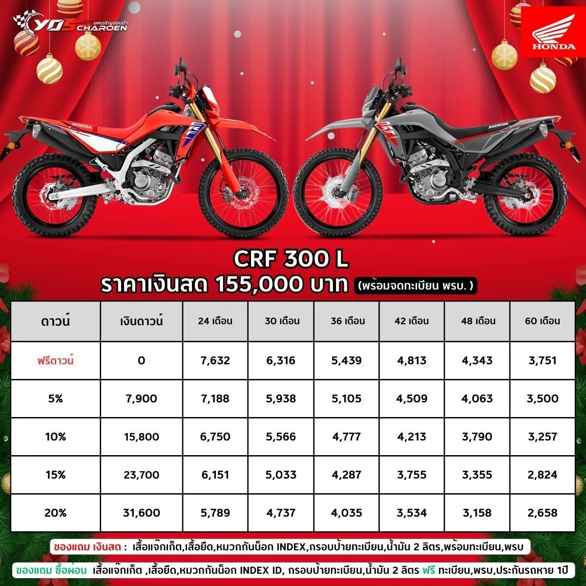 ฮอนด้า CRF300 คือมอเตอร์ไซค์แนวเอนดูโร่ที่ผสานสมรรถนะและความทนทาน ด้วยเครื่องยนต์แบบสูบเดียวระบายความร้อนด้วยน้ำ ให้แรงบิดดี ตอบสนองทันใจทั้งทางฝุ่นและทางดำ โครงสร้างน้ำหนักเบาแต่แข็งแรง พร้อมช่วงล่างที่ให้ระยะยุบยาว ทำให้ขับขี่ได้มั่นใจแม้บนเส้นทางท้าทาย ระบบเกียร์